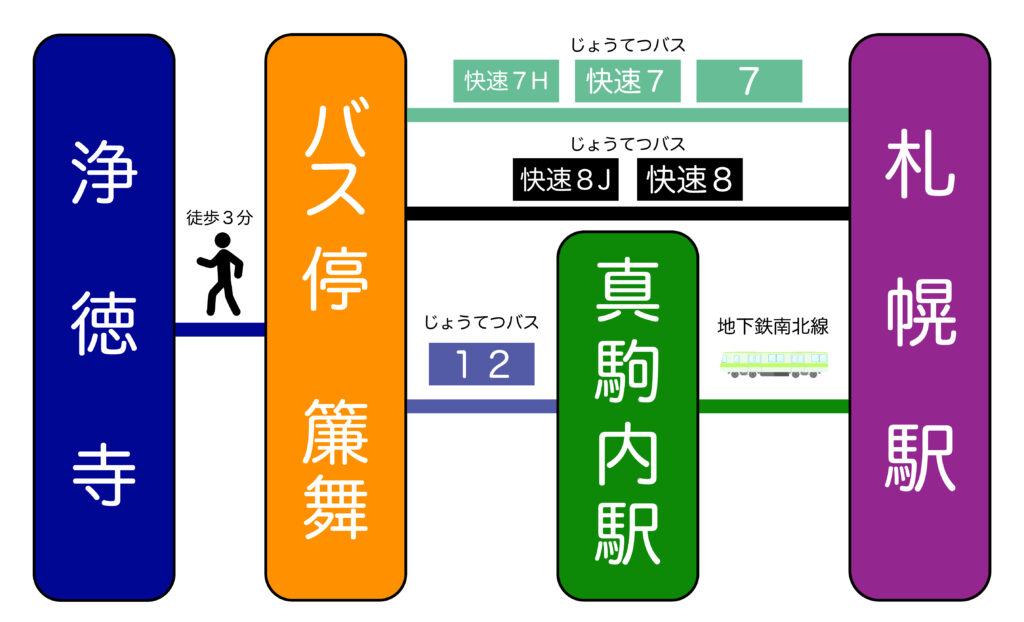 札幌北ICより高速を降り、創成川通り(国道5号線)を南下し、大通東1の中央バス札幌ターミナルのある交差点で国道12号線(北1条・雁来通)へと右折し、真っすぐ進んで国道230号線の北1条・宮の沢通りへと進みます。北1条西11条目の交差点を左折して石山通に入ります。そこからはずっと230号線を進みますと、右手にお寺が見えてきます。